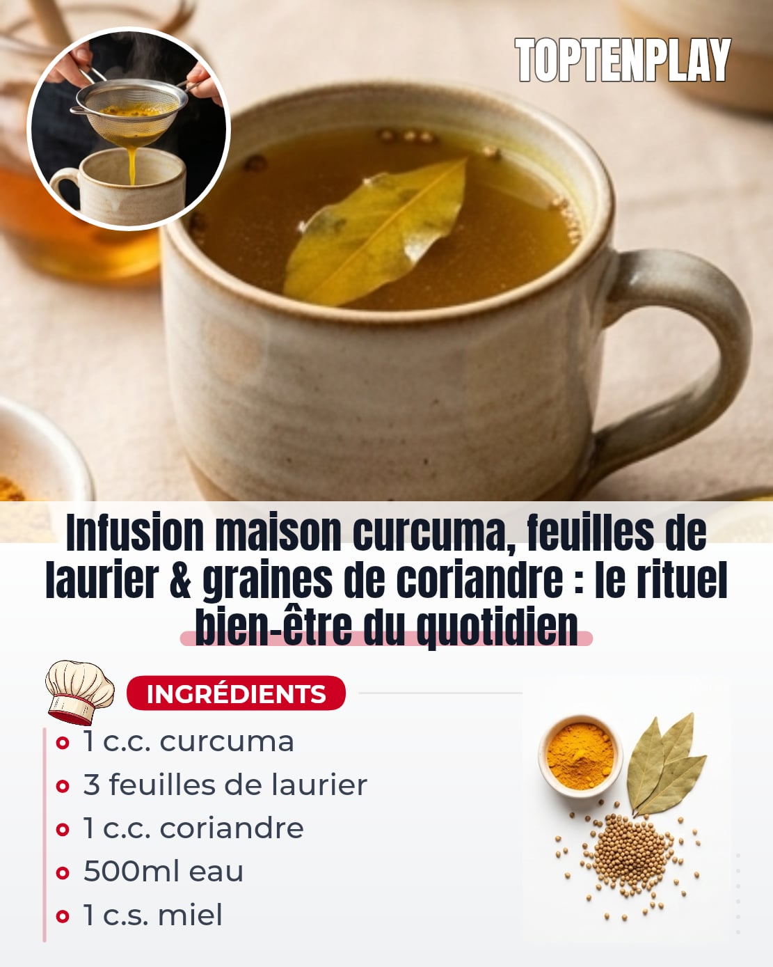 On imagine souvent les infusions bien-ĂȘtre comme des remĂšdes de grand-mĂšre au goĂ»t de pharmacie. La rĂ©alitĂ© de celle-ci est bien diffĂ©rente : elle sent le curry doux, elle colore lâeau dâun jaune ambrĂ© profond, et elle a quelque chose de terriblement rĂ©confortant. Pas besoin dâĂȘtre naturopathe pour lâadopter â juste une casserole et dix minutes.