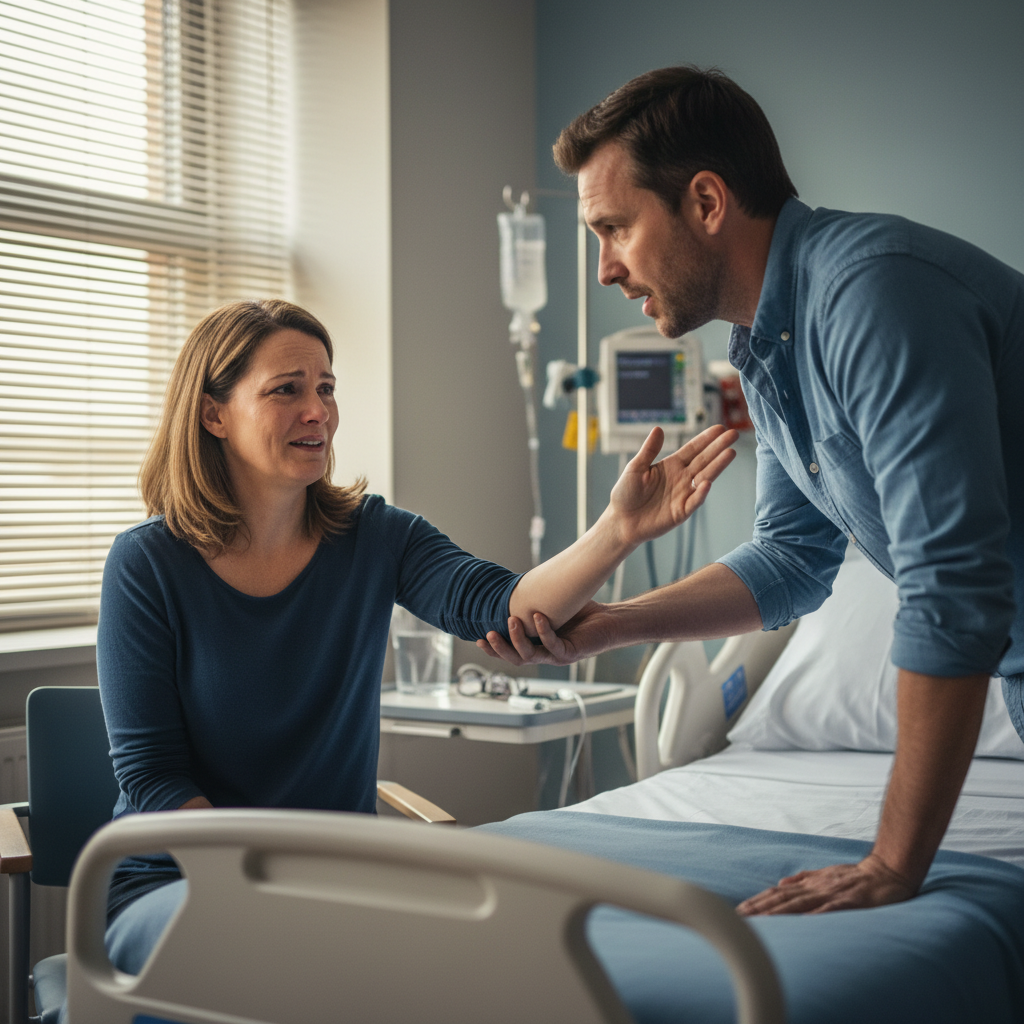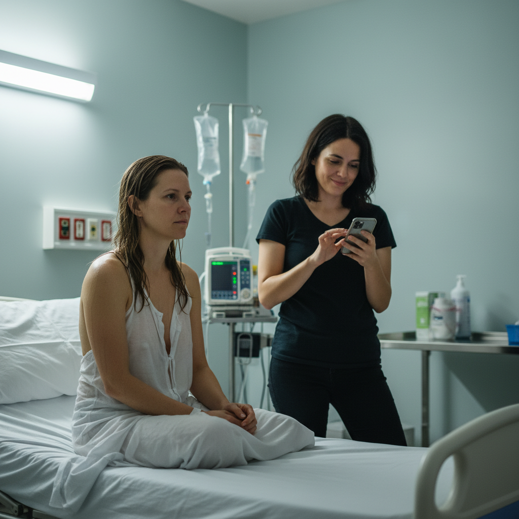 J’étais assis sur le lit de l’hôpital quand elle a scruté et dit, Là pour l’appareil photo, comme la tension construite